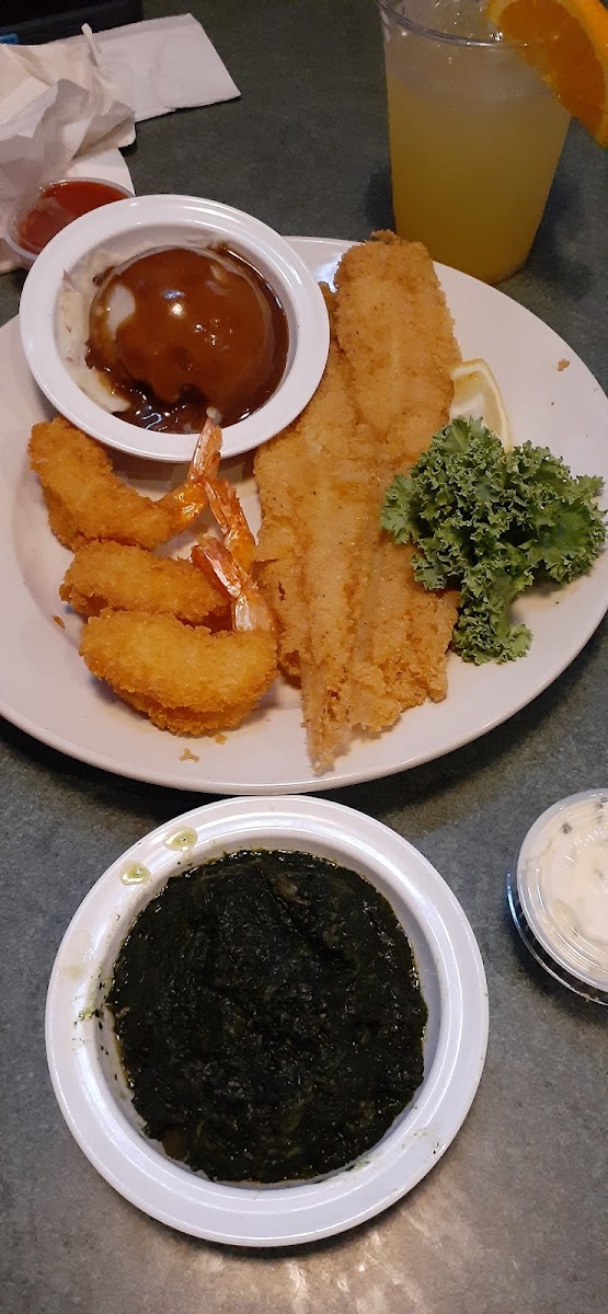 We went here for a quick lunch before heading back to VA and it wasn't too bad. The lighting could have used a little improvement since it was 11:30 in the morning. We had the fried oysters and the grilled jerk chicken for the appetizers. The jerk chicken was not spicy at all. There was some seasoning and the flavor was not too bad but I was expecting to get a spicy taste and it just fell flat in that area. It would have been good with a bbq sauce since it was grilled but it came with a honey mustard. For the meal we had shrimp and fried flounder. Portion size was good and the food was good. The coleslaw was a little sweet but overall, it was good. The only reason why I didn't do 5 stars is because the atmosphere was a little lack luster, the drinks were very sweet, and the garnish on the plates was a little out dated to me. The food was good and the service was good too. There was no wait so that was also a good thing. I would like to go back and try some other things on the menu.